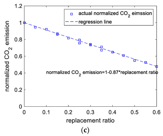 Results of CO2 emissions analysis. (a) Calculated versus regressed results of CO2 emissions. (b) Perturbations of variables of CO2 emissions. (c) CO2 emissions versus replacement ratio.