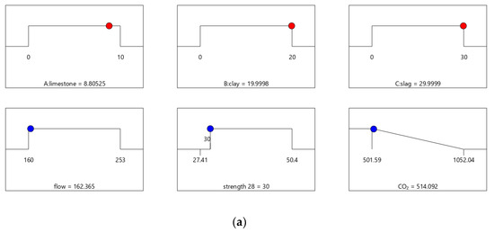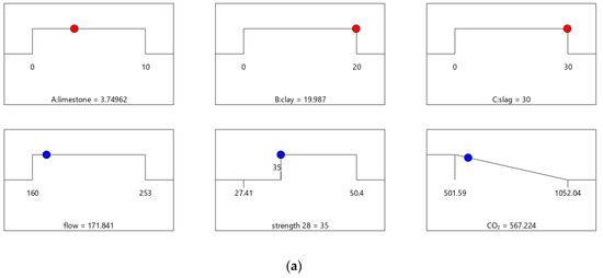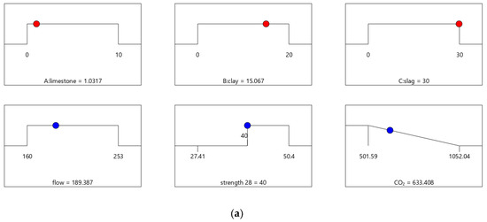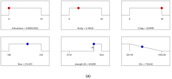 Figure 6, Figure 7, Figure 8 and Figure 9 show the independent variables (limestone, calcined clay, and slag) and responses (strength, flow, and CO2 emissions) of Mix-30 to Mix-45, respectively. In Figure 6a, Figure 7a, Figure 8a, and Figure 9a, the first row represents limestone, clay, and slag contents, and the second row represents the results of multi-objective optimization (such as flow, strength, and CO2 emissions). The optimized flow and strength meet the constraints of the target range, and the optimized CO2 emissions are the minimum value. From the minimum value of 501.59 to the maximum value of 1052.04, the CO2 optimization decreases with the falling line. This means that the closer the CO2 emissions are to the minimum value of 501.59, the higher the satisfaction degree of the optimization; on the contrary, a lower optimization satisfaction degree occurs when the CO2 emissions are closer to the maximum value of 1052.04. Figure 6a shows that the limestone, calcined clay, and slag contents of Mix-30 are 8.81%, 20%, and 30%, respectively. Solid red circles in the first row of Figure 6a show the component values of limestone, clay, and slag. The content of the mineral admixtures is close to the upper limit. Solid blue circles in the second row of Figure 6a show the response values for strength, flow, and CO2 emissions. The strength and flow rate both meet the design requirements. The CO2 emissions are close to a minimum. Figure 6b shows the desirability of the flow, 28-day strength, and CO2 emissions, as well as the composite desirability. The desirability is 1 for both the 28-day strength and flow. The composite desirability value for Mix-30 is 0.977.