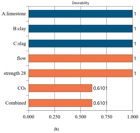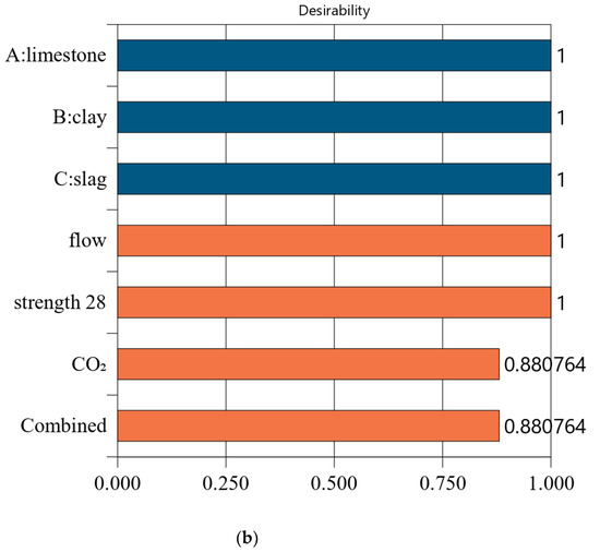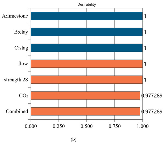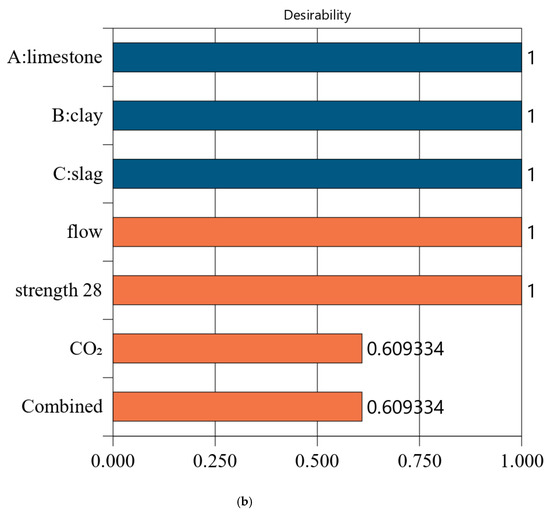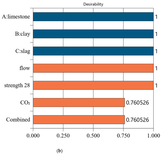 Figure 7 shows the desirability of Mix-35. The limestone, calcined clay, and slag contents of Mix-35 are 3.75%, 19.98%, and 30.00%, respectively (see the first row in Figure 7a). Since the replacement rate of mineral admixture in Mix-35 is smaller than that in Mix-30, Mix-35 has higher CO2 emissions than Mix-30. The desirability is 1 for both the strength and flow, but the CO2 emissions are less desirable than those for Mix-30. This is because as the strength of the concrete increases, its carbon dioxide emissions also increase, resulting in a decrease in the desirability function corresponding to CO2 emissions. In addition, Mix-35 has a lower composite desirability than Mix-30 (as shown in Figure 6b and Figure 7b).