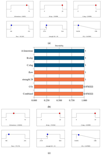 The optimization goals are listed in Table 7. The independent variable—the content of limestone, calcined clay, and slag—should be within the lower and upper limits. The variables of the response are as follows: (1) The 28-day strength should not be less than the target strength. In this study, the 28-day target strength values were set to 30, 35, 40, and 45 MPa. (2) The flow should be not less than the target flow (160 mm). (3) The CO2 emissions should be as low as possible for purposes of ecofriendliness. In this study, Design Expert software (version 12) was used for the optimization design [29]. The relative importance r and weighting factor S of all responses were set to 1 [26].