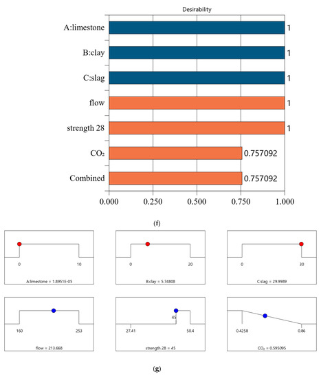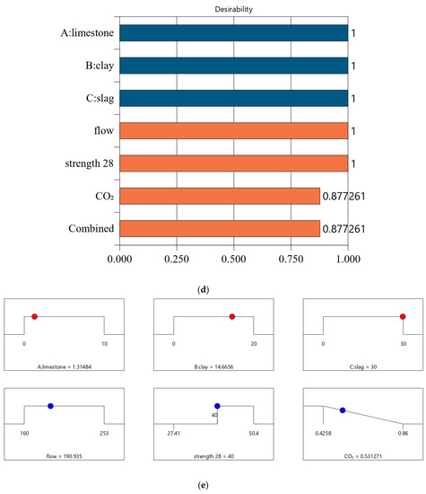 In summary, we consider four optimal design cases with different design strengths. Each design case considers basic requirements (strength and workability) and an ecological factor (CO2 emissions). Multi-objective optimization was implemented based on a composite desirability function, which was calculated using the responses and individual desirability.