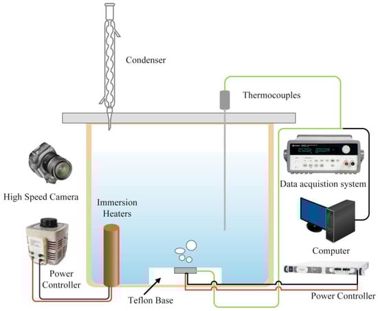 Due to the inconvenience of welding ceramic and aluminum alloy samples, the experimental samples were fixed on the heating surface by a thin steel wire similar to the method employed by Aznam [29]. Condensers and auxiliary heating rods were arranged at the top and bottom of the boiling pool, respectively, which were used to condense the water vapor generated by the experiment and heat the deionized water to make it boil. Before each experiment, we turned on the auxiliary heating rod and heated the deionized water to boiling for 1 h to remove non-condensable gas from the water. In addition, a T-type thermocouple was installed near the sample to detect changes in the water temperature. The movement of bubbles in the experiment was recorded using the high-speed camera (MotionXtra N4, from IDT Inc., San Jose, CA, USA).