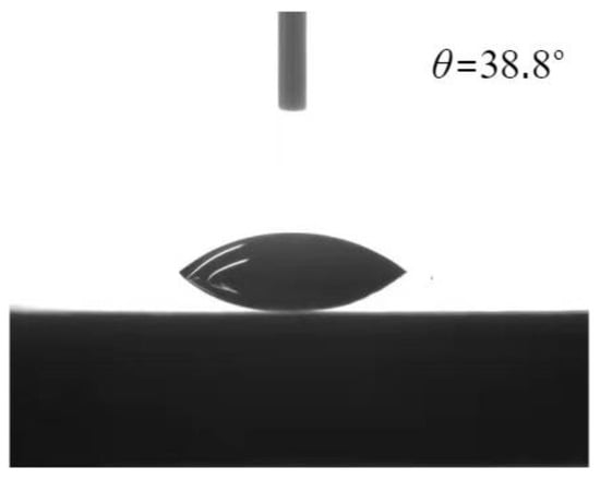 For the purpose of characterizing the surface wettability, 5 μL of deionized water was used to measure the static contact angle at room temperature. Video capture and contact angle analysis were performed by goniometer (Kruss, DSA30, Hamburg, Germany). The static contact angle of the smooth surface was 38.8°. The contact angle is illustrated in Figure 2.