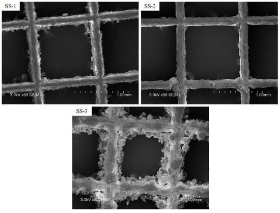 The surface morphology of surface microporous composite porous samples, prepared under different printing process conditions, was analyzed. Sample SS-1 and sample SS-2 were designed using the same printing process (Table 1), where the SS-2 sample was sandblasted to remove bonded, unmelted metal powder from the surface. The SEM photos of the three groups of samples are shown in Figure 3. The SS-1 sample has better forming quality, and only a small amount of unmelted powder is bonded on the surface. The SS-2 sample is the surface morphology of the sample after sandblasting. The powder on the surface after sandblasting is removed, and the surface is relatively smooth.