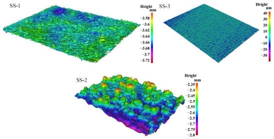 The surface characteristics of 3D-printed samples were analyzed using a three-dimensional profilometer (InfiniteFocus G4), as depicted in Figure 4. The sample is placed in the lens aperture range of the three-dimensional profilometer stage, and the sampling software is set up for surface scanning. The three-dimensional profilometer will automatically zoom to complete the sampling of the surface morphology according to the surface characteristics of the sample. It can be seen that the surface morphology of the sample is affected due to process limitations, and the surface of the sample skeleton is uneven, which corresponds to the SEM photographs in the previous section. Because of the sandblasting treatment, the surface of the SS-2 sample is smoother than that of the other two groups, while the surface morphology of the SS-1 sample without sandblasting treatment shows obvious roughness. The surface of sample SS-3 shows obvious mountain-like protrusions and the surface is rougher.