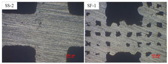 In addition to scrutinizing the surface morphology and roughness characteristics of the printed sample, Figure 5 shows the metallographic photos of the SS-2 and SF-1 samples to facilitate the analysis of the internal pore characteristics of the porous sample skeleton. The SS-1 sample in Figure 5 was prepared using a small scanning spacing process. It can be seen that the composite pore skeleton is dense and that it does not contain micron pores. In contrast, the SF-1 sample was prepared using a large scanning spacing method, and the sample skeleton contained micropores. By controlling the scanning distance of 3D printing and combining it with the design of macro-sized pores, the controllable preparation of composite porous structures featuring micron-sized pores and millimeter-sized pores is achieved.