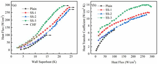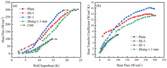 It can be seen from Figure 7a that the heat flux curves of the three samples are significantly different. In the low heat flux region, the heat flux of SS-3 was greater than that of SF-1 under the same wall superheat, and the surface microporous composite porous junction had better heat transfer ability. Under high heat flux conditions, the heat flux curve of SF-1 was located on the left side of SS-3, indicating that the framework microporous composite porous structure can achieve better heat transfer performance under high heat flux conditions. The grid pore size used by Zhang [27] was also 1.1 mm, but its heat flux curve was located on the right side of the current research throughout the entire heat transfer process, and its heat transfer performance was lower than that of the current composite porous structure. The CHF of the composite porous structure with two different pore forms was not significantly different, and its value was slightly lower than Zhang’s result.