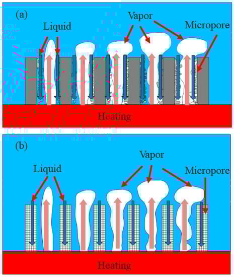 The pore structure of the composite porous structure is the main reason for the difference in heat transfer. Figure 8 illustrates the schematic diagram of the gas–liquid flow inside the two composite porous structures. The schematic diagram of the gas–liquid flow in a surface microporous composite porous structure is shown in Figure 8a. Bubbles grow along the heating surface and escape upward from the center of the large channel. The microporous layer on the surface of the sample promotes nucleation, and the liquid is supplied downward along the surface of the sample skeleton to the heating surface. The surface microporous composite porous structure increases the heat transfer area and nucleation sites at low heat flux, resulting in a higher heat transfer coefficient. In the high heat flux region, the millimeter channel should not only bear the effective supply of liquid but also bear the escape of bubbles, which limits its heat transfer enhancement under high heat flux. Robinson et al. [31] found that the effective pore size of several tens of micrometers inside the porous skeleton sample can achieve better capillary performance and permeability. The pores inside the SF-1 sample discussed in this paper demonstrate favorable interconnectivity, thereby facilitating a harmonious interplay between the capillary performance and the permeability. For the framework microporous composite porous structure, the micropores within the framework act as supplementary pathways for liquids, while macroscopic pores become the main pathway for bubble escape (Figure 8b). In the high heat flux region, the micropores in the framework microporous composite porous structure form different divisions of labor from macroscopic pores. Consequently, compared to the surface micropore composite porous structure, the framework micropore composite porous structure can achieve a higher heat transfer coefficient in high heat flux regions.