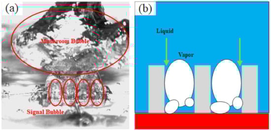As previously observed, augmenting the microporosity on the surface or inside the framework of the 3D-printed sample through a controlled printing process parameters enhances the HTC of the composite porous sample but has no significant impact on the CHF improvement. Due to the presence of large pores within the sample, bubbles are confined within square cavities, impeding their coalescence and departure from the heating surface at a higher frequency compared to the smooth surface. This subsequently enhances the effective replenishment of the liquid, thereby improving the heat transfer efficiency of the heating surface. As the heat flux increases, the size of the initial bubbles generated on the heating surface also correspondingly increases [32]. The large square pores in the composite porous structures can effectively constrain bubble coalescence, which is the key to improving the CHF of composite porous structures. Figure 9 depicts a photo of the high-speed motion of bubbles in a composite porous structure and a schematic diagram of gas–liquid flow.