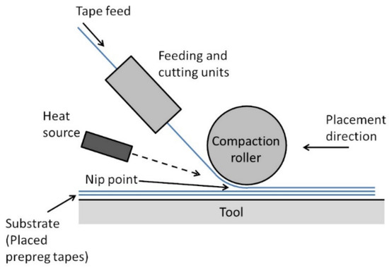 Schematic diagram of automatic fiber placement with in situ curing function [12], (figures are reproduced and adapted with permission).