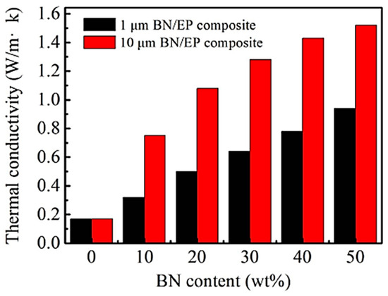 Epoxy resins, for example, have good thermal stability and low cost, but at the same time have low thermal conductivity (0.2 W/m-K) as well as a high coefficient of thermal expansion. To improve the thermal conductivity of epoxy resins, carbon, aluminum, magnetite, brass, copper, graphite, short carbon fibers, and copper nitride have been widely used as dopants to prepare epoxy resin-based composites. For example, Salunke et al. [41] investigated the effect of the size and content of BN in boron nitride (BN)-reinforced epoxy resin matrix composites on the thermal conductivity and dielectric properties of the composites. It was found that the thermal conductivity and electrical resistivity of the composites containing different sizes of BN could be effectively improved, and the relevant results are shown in Figure 5. In addition, Zhang et al. [42] doped BN into carbon-fiber-reinforced epoxy resin matrix composites, and similarly achieved the enhancement of the thermal conductivity of the composites. Donnay et al. [43] prepared boron nitride epoxy resin composites by the ball milling method, and explored the effect of micro- and nano-boron nitride particles on the thermal conductivity of the composites. The results showed that the thermal conductivity of boron nitride epoxy composites tended to increase linearly with the increase in the volume fraction of boron nitride. Huang et al. [44] chose spherical boron nitride and flaky boron nitride to investigate the effect of the shape of boron nitride on the thermal conductivity of the composites. The results show that the thermal conductivity of the composites shows an increasing trend with the increase in the volume fraction of spherical or flake boron nitride, but the flake boron nitride enhances the thermal conductivity of the composites more obviously. Spherical fillers can reach a large filling amount, but the contact area between the filler particles is relatively small, mainly in point contact, resulting in poor heat transfer efficiency of the material. Irregular-shaped fillers or sheet fillers have a larger contact area and better heat transfer effect, but the filling amount is smaller.
