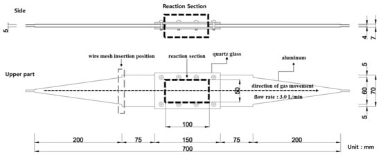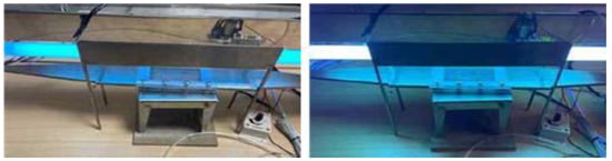 The photoreactor was made of aluminum and a wire mesh was inserted into the reactor to form a constant airflow. Figure 1 and Figure 2 show the schematic and photographs of the photoreactor prepared and installed, respectively. In addition, to minimize the influence of light other than that from the photoreactor and UV lamp used in the experiment, the space where the experiment was conducted was configured as a dark room.