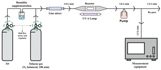 To confirm the toluene reduction effect of the TiO2 photocatalyst, the following information was applied to the experiment. Toluene gas in a cylinder compressed to 100 atm pressure was used, and nitrogen was assumed to be added to the carrier gas at a concentration defined in the carrier gas, as specified in the analysis certificate provided by the gas supplier. Next, mixed gas containing pollutants with a flow rate of 3.0 L/min was injected into the photoreactor through wet air mixing using a ball flow meter and a regulator to constantly maintain the measured flow rate of 1.5 L/min, as listed in Table 2. The remaining mixed gas with a flow rate of 1.5 L/min was discharged via the bypass.
