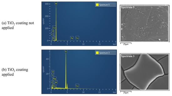 The material constituting the coating agent was identified through field emission SEM (FE-SEM) and EDS mapping analysis (see Table 4) at the Chonnam National University Joint Lab (Yeosu City, Jeollanam-do, Republic of Korea). This analysis was used by Rengui et al. [50] and Nguyen et al. [51] to study the properties of the TiO2 photocatalyst and coating agent used in this study.