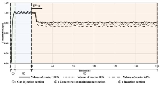 Figure 7 and Table 10 present the experimental results obtained by utilizing a UV-A irradiance of 15 W/m2, representing a 60% increase compared to that in condition 1, as well as changing the pollutant volume to confirm the changes in the toluene reduction performance depending on the increase in UV-A irradiance.