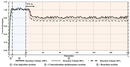 This experiment is significant as a basic research step to determine the appropriate amount of light and duct diameter when using photocatalysts in ventilation devices. First, the light intensity of lamps installed in ventilation devices decreases depending on their lifespan, which may also reduce pollutant reduction performance. In general, the lifespan of a lamp is considered to be until the initial light output decreases by 20 to 30% [46]. Accordingly, in this experiment, the toluene reduction concentration was determined based on when the lamp’s light output dropped by 25% compared to before and when it dropped to 50%, which is an even worse condition. Second, the performance review according to volume change aims to examine the impact of changes in ventilation duct size. A change in volume occurs depending on the distance between the light source and the photocatalyst coating; accordingly, the corresponding toluene reduction concentration was determined.