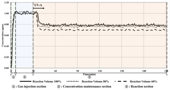 This study applied a TiO2 photocatalytic coating agent under the previously stated ISO experimental conditions to analyze its toluene reduction effect. Figure 9 shows the combined results of the toluene-reduction trend experiments that applied UV-A irradiance and the volume of the reactor as variables.
