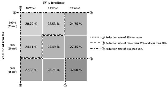 In Figure 9, section ① exhibited the highest reduction rate of 31.69% when the UV-A irradiance was 20 W/m2, and the volume of the reactor was 60%. In section ②, the toluene concentration decreased, and the reduction rate was higher and lower than 25% and 30% (minimum and maximum of 24.99% and 28.97%), respectively. The reduction effect can be obtained even at low UV-A irradiance by decreasing the volume of the reactor. The effect can also be achieved by increasing the UV-A irradiance as the volume of the reactor increases. In section ③, the toluene concentration decreased from 20.84% to 24.11%. In this section, we discuss how a high reduction rate can be achieved when the UV-A irradiance and volume of the reactor are changed simultaneously.