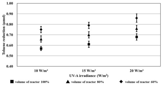 The trend equations of the graphs shown in Figure 9 can be calculated as listed in Table 14. The slope of the graph increased almost linearly as the UV-A irradiance increased under a constant volume of the reactor. Furthermore, the y-intercept increased as the volume of the reactor decreased. The toluene reduction rate increased by 27% when 60% volume of the reactor was applied instead of 100% volume.