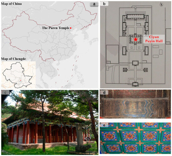 Puren Temple: (a) location map of Puren Temple; (b) floor plan of Puren Temple; (c) the main hall, Ciyun Puyin Hall, in the Puren Temple; (d) color painting on ancient wooden architecture; (e) ceiling painting.