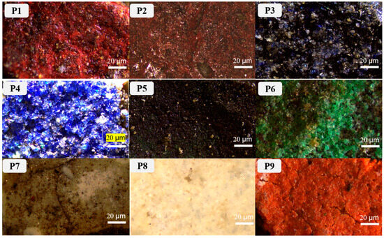 The composition of color paintings primarily comprises pigments and glues, wherein the pigments are responsible for the vibrancy of the artwork and hold paramount importance in the study of color painting [3,4,5]. Additionally, the glues serve to securely bind the pigments to the underlying substrate. The utilization of pigments and glues is intricately linked to the specific artistic themes conveyed in color paintings, the contextual factors specific to the locality, and the prevalent production techniques of the era. These pigments can be broadly classified into two categories: mineral pigments and organic dyes. The choice of selecting mineral pigments in color painting exhibits substantial similarities, primarily determined by color, composition, and expense, albeit with minor deviations in binders [4,6,7]. Prominent mineral pigments frequently employ encompass cinnabar, lead red, iron oxide, carbon black, stone green, lead white, malachite, and stone blue [2,8,9,10,11]. Hitherto, professionals in the field of heritage conservation have employed diverse techniques to scrutinize and ascertain the constituents of heritage pigments, including visible light microscopy, polarized light microscopy, energy-based X-ray fluorescence spectrometry (SEM-EDX), X-ray diffraction (XRD) [12,13,14], X-ray energy spectrometry (EDS) [9,10,15,16], X-ray emission spectroscopy (XPS) [17], and micro-Raman spectroscopy (m-RS) [18,19,20,21,22]. For example, m-RS was used for pigment identification of the Arshai cave murals [18] and the Santa Maria de Lem-On-Iz murals [23]; Fu Peng et al. used Raman combined with XRD for a series of explorations of pigments from the Qing Xi Ling paintings, and Wang Xin et al. used Raman combined with SEM-EDS for the analysis and identification of pigments from the Huayan Temple paintings of the Liao Dynasty, generally in the context of when analyzing heritage pigments for testing, researchers use a combination of methods.