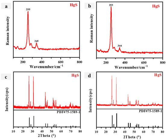Red is a prevalent color in ancient Chinese painting, with vermilion, lead red, iron red, and other common pigments being used. The element analysis of red samples P1 and P2, as presented in Table 2, reveals the presence of Hg, Pb, and Ca. Considering the relevant literature, it is plausible to infer that the red pigments might be either vermilion or lead red. The Raman spectrum and XRD analysis data of the red samples are depicted in Figure 3, respectively. Notably, the Raman peaks of the red pigments were observed at 255 cm−1 (vs) and 345 cm−1 (w) (Figure 3a,b). A comparison of the red sample Raman spectrum with the standard spectrum reveals that the peak at 255 cm−1 is attributed to a Hg-S stretching vibrational band. Additionally, the bands at 349 cm−1 (w) were identified as the degenerate E modes, which can be assigned to the normal modes ELO and ETO [41,42,43,44]. This finding confirms that the red pigment is cinnabar, which aligns with the results obtained from the ED-XRF analysis (Table 2). In the XRD analysis of the red sample, strong peaks can be seen at angles of 26.5°, 28.2°, and 31.2°. These three peaks exhibit conformity with the primary XRD peaks observed in the standard HgS product, suggesting that the sample a/b corresponds to vermilion, a finding that aligns with the conclusions drawn from ED-XRF analysis. Vermilion, a pigment extensively employed in ancient Chinese painting, traces its origins to the Yang-shao culture and was frequently utilized in various forms of artwork, including ancient architectural painting [42]. As investigated by Wang Shoudao et al., the examination of the patterned pigments found in silk weavings (N-5) recovered from the Mawangdui No. 1 Han tomb in Changsha revealed the presence of pure vermilion [42]. Additionally, vermilion pigment was identified in oracle bone inscriptions unearthed from the Yin Market in China, dating back to the Shang dynasty [45].