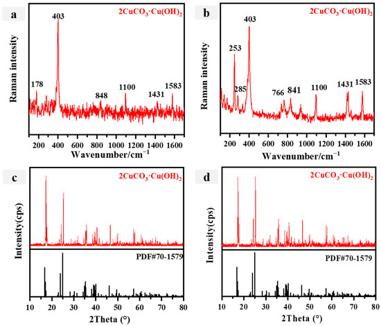 (a,b) Raman spectra for the green pigments (a: P5; b: P6); (c,d) Xray diffraction spectra of the green pigments (c: P5; d: P6).