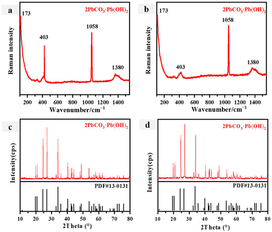 The elemental composition of P7 and P8 exhibits notable similarities, as both white pigments primarily consist of Pb, Ca, and Si, albeit with relatively low concentrations of Ca and Si. Consequently, it is plausible to hypothesize that these elements originated either from the underlying soil layer or surface dust contaminants. In ancient China, various white pigments containing elemental Pb, such as lead white, cerussite, and phosgenite, were commonly employed. The main Raman peaks (Figure 6a,b) at 173 cm−1, 403 cm−1, 1058 cm−1, and 1380 cm−1 indicate that the white pigment was anglesite [Pb3(OH)4CO3] [52,53,54,55,56,57]. To ascertain the specific nature of P7 and P8, we conducted a comprehensive analysis utilizing XRD in conjunction with other techniques. The white pigment’s X-ray diffraction pattern is shown in Figure 6c,d. The most prominent peak in the XRD pattern occurs at 26.4°, which corresponds to the diffraction peak of quartz. This observation suggests the presence of quartz in the sample, potentially originating from the ground pillar layer or surface dust pollutants containing Ca and Si elements. Consequently, based on the identification of diffraction peaks at 24.6° and 36.1°, corresponding to the diffraction peaks of Pb3(OH)4CO3 (JCPDS no. 13-0131), it can be concluded that the white pigments P7 and P8 are lead white. Lead white, a synthetic pigment, was produced in China starting from the fourth century BC and found extensive application, such as in the Jiangxue Palace located within the Imperial Museum at the Mogao Grottoes and on the canvas oil painting Rebecca at the Well of Neapolitan anonymous [58].
