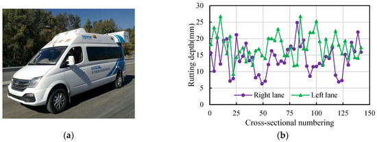 The ZOYON-RTM intelligent road comprehensive detection vehicle (Figure 2a) was used to identify the permanent deformation state of Changyu Expressway. The detection system uses high-frequency, high-precision line-scan imaging 3D data acquisition technology to automatically obtain permanent deformation depth. The detection speed was 35 km/h and the temperature in the field was 30 °C. The permanent deformation depth in the typical pavement segment selected is shown in Figure 2b. The permanent deformation depth on the Changyu Expressway ranges from 6.31 mm to 26.75 mm, and the average value is 15.79 mm.
