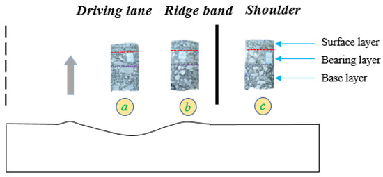 The aim was to enhance our understanding of the root causes of permanent deformation and to determine the contribution of each asphalt pavement layer to the permanent deformation. To achieve this goal, a set of full-depth core samples (with a diameter of 100 mm) were extracted. These samples were extracted from wheel paths in the same cross-section in the driving lane, the ridge band between wheel paths and shoulder, and the pavement shoulder, respectively. The layout scheme of field cores in a section is illustrated in Figure 3. One core (a) was drilled on a wheel path, one core (b) was drilled on the ridge band, and one core (c) was drilled on the road shoulder. Through examination of the changes in thickness within the field cores, the layer in the asphalt pavement where permanent deformation significantly occurs can be identified. Evidence from the literature shows that permanent deformation is closely related to the pavement materials and structures [11,15]. Hence, the design index for permanent deformation should be considered in the material design of the asphalt mixture located in that layer.
