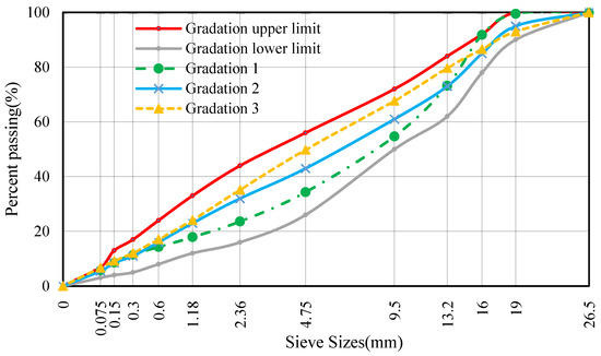 AC-20 mixture is commonly used in China for the construction of the bearing layer [14,16]. To clarify the influence of aggregate gradation on asphalt mixture performance, a comparative analysis was conducted on three AC-20 gradation options. The gradation composition of these asphalt mixtures is shown in Figure 4.