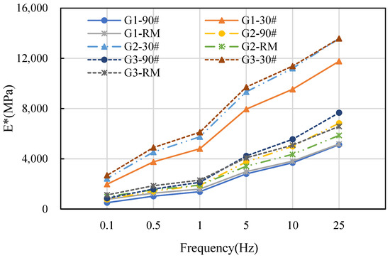 Figure 6 presents the dynamic modulus curves at different frequencies, with an asphalt content of 4.5%. The dynamic modulus exhibits an increase as the frequency increases. The reason for this is that when the frequency is modified, the load will not be compressed to its full extent, and the “unload” will not bounce back entirely, resulting in energy buildup. As the frequency increases, the energy levels rise, and the strain decreases when subjected to constant stress. Therefore, the dynamic modulus will gradually increase.