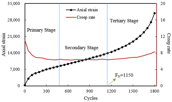 Empirical evidence suggests that the dynamic creep test has a very strong correlation with permanent deformation depth and a high capability to estimate the potential of permanent deformation [33]. The dynamic creep test has been used to judge and predict permanent deformation, and to investigate the creep law and extent of deformation of asphalt mixtures under repeated loads [34,35]. According to existing research results, creep development of asphalt mixtures has three distinct strain stages [36]: (1) primary stage, in which the strain rate decreases; (2) secondary stage, in which the strain rate is constant; and (3) tertiary stage, in which the strain rate increases. The loading cycle corresponding to the deformation curve upon reaching the third stage is defined as the flow number (FN). During the stable period, the rate at which strain increases per unit of time under a unit of stress is known as the creep rate. The flow number and creep rate are commonly used as indicators to evaluate the stability of asphalt mixtures at high temperatures [37]. Figure 8 shows an example of a creep curve.