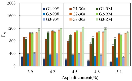 The flow number is used to describe the permanent-deformation behavior of an asphalt mixture under loading stress with time. A higher flow number indicates a greater resistance to permanent deformation for the asphalt mixture. As seen in Figure 9, for asphalt mixtures with the same gradation and asphalt content, the flow number of the 30# ordinary asphalt and rubber-modified asphalt mixture were not significantly different, but they were significantly higher than that of the 90# asphalt mixture. This indicates that 90# asphalt mixture has poor high-temperature resistance. For the asphalt mixture with the same asphalt content, the flow number of gradation 1 was the smallest, followed by that of gradation two, and the flow number of gradation three was the largest. Within a certain range of asphalt content, the flow number of the 90# asphalt mixture decreased monotonically with an increase in asphalt content. For the 30# asphalt, both alone and in rubber-modified asphalt mixtures, the flow number of the 30# asphalt mixture with gradation one decreased monotonically with an increase in asphalt content. However, the flow numbers of the other mixtures first increased and then decreased with an increase in asphalt content. The inflection points appeared at the asphalt contents of 4.2% and 4.5%. The results indicate that the flow number of asphalt mixture is significantly affected by the asphalt type, gradation type, and asphalt content.