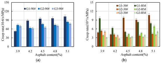 Creep rate at different asphalt contents: (a) 90#, (b) 30# and RM.