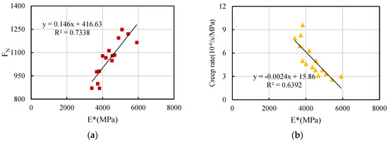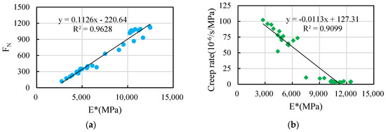 Figure 11a conveys that the flow number of ordinary petroleum asphalt mixture has a strong correlation with the dynamic modulus. The flow number increases linearly with the increase in dynamic modulus. The correlation coefficient between them is 0.9628. As shown in Figure 11b, it is evident that the creep rate exhibited by ordinary petroleum asphalt mixture is positively correlated with the dynamic modulus. The creep rate decreases linearly with an increase in dynamic modulus. The correlation coefficient between them is 0.9099.