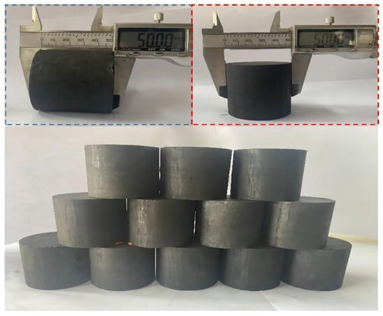 The specimens were taken from a mine in the northwestern part of Changwu County, Xianyang, Shaanxi Province, China, with a production capacity of 4.5 Mt/a. The average depth of the working face is about 990 m, the average thickness of the coal seam is 7.8 m, the inclination angle of the seam is 0–8°, and the average inclination angle is 4°. There are no faults, trap columns, or magma intrusions, and the structure is simple in the working face. In accordance with the recommended standards of the International Society for Rock Mechanics (ISRM), the coal specimens were cored, polished, and processed into cylindrical coal specimens with a diameter of 50 mm and a height of 50 mm, and drilled according to the test program, which required the borehole direction to be perpendicular to the direction of the joints. Next, the two ends of the specimens were polished, so that the flatness of the two end surfaces and the perpendicularity error were within 0.02 mm. Physical drawings of the processed coal specimens are shown (Figure 1).