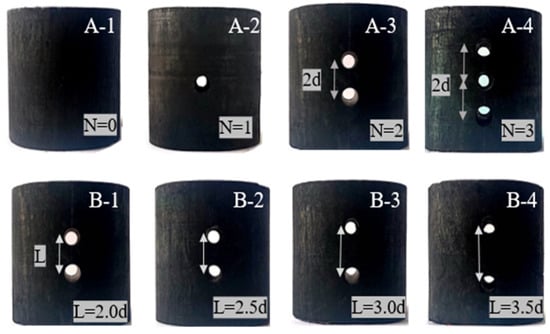 To reduce errors that may be caused by the non-uniformity of coal, six parallel specimens were prepared for each group. The data showing large dispersions were removed, and three groups of valid data were selected. The arrangement of boreholes is shown (Figure 2), with the diameter (d) of the boreholes being adjusted to d = 6 mm. A-1~A-4shows four groups of specimens with a variable number (N) of boreholes, where N = 0, 1, 2, 3; and B-1~B-4 shows four groups of two-borehole coal specimens with variable borehole core spacing (L), where L = 2.0, 2.5, 3.0, and 3.5d.