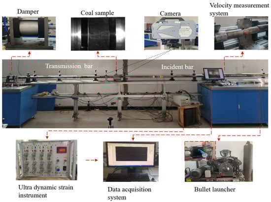 This test used an SHPB device with a bar diameter of 50 mm for impact testing (Figure 3). The device that was used consisted mainly of a spindle-shaped bullet, an incident bar, and a transmitted bar, with bar lengths of 2500 mm in high hard aluminum with a longitudinal wave of 5000 m/s and a modulus of elasticity of 71 GPa. To control the speed of impact, the air pressure was adjusted to deliver a half-sinusoidal wave loaded with a constant high strain rate (110 s−1) to the coal specimens. Two sets of strain gauges, which were connected to the incident and transmitted bars, were placed 1250 mm away from the location where the coal specimens were placed. The impulse signals generated by the impact were acquired using an ultra-dynamic strain instrument and an oscilloscope, and were recorded and saved. During the loading process, an ultra-high-speed camera from Japan’s PHOTRON LIMITED with a resolution of 640 × 280 and a frame rate of 100,000 fps/s was used to record the damage pattern of the coal specimens.