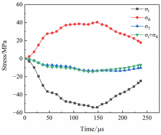The waveforms of the SHPB tests of the coal specimens are shown (Figure 4). The stress wave curves were smoother without obvious spikes [20]. During impact tests, stress balance verification is required to ensure the accuracy of test results [21]. The signals were recorded using an ultra-dynamic strain instrument, and the stress wave graphs were obtained via data processing (Figure 5), where σI, σR, and σT are the incident wave, reflected wave, and transmitted wave, respectively. The figure shows that the superposition curve of the incident and reflected waves was coincident with the curve of the transmitted wave, indicating that the stresses at both ends of the coal specimens had reached equilibrium during the loading process.