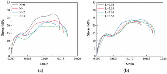 Stress–strain curves of specimens with (a) different numbers of boreholes and (b) different spacings of boreholes.