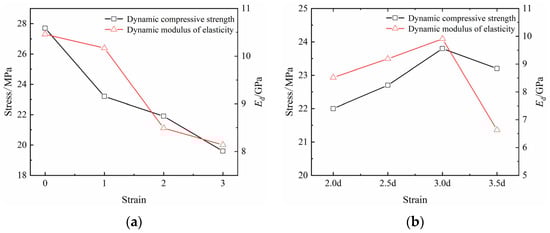 The variation curves of the dynamic compressive strength and dynamic elastic modulus corresponding to different numbers of boreholes are shown (Figure 7a). The results showed that the dynamic compressive strengths of the coal specimens with N = 0–3 were 27.7, 23.2, 21.9, and 19.6 MPa, respectively, indicating that, compared to the complete coal specimens (N = 0), those with N = 1–3 showed decreases of 16.25, 20.94, and 29.24%, respectively. The dynamic moduli of elasticity (Ed) of coal specimens N = 0–3 were 10.46, 10.17, 8.49, 8.14 GPa, respectively, indicating that, compared to intact coal specimens N = 0, those with N = 1–3 showed decreases of 2.77, 18.83, and 22.18%, respectively.