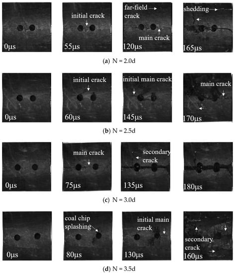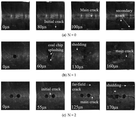 A high-speed camera was used to photograph coal specimens with different borehole arrangements during the impact process [23,24,25]. The crack extensions and macroscopic damage of the coal specimens at different stages are shown (Figure 8 and Figure 9).