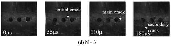 The crack expansion process of coal specimens with different numbers of boreholes are shown (Figure 8). At 80 μs, the initial cracks of the complete coal specimens were first generated below the coal specimens, with the main crack through the coal specimens being generated in the middle of the coal specimens along the direction of loading, following which secondary cracks sprouted perpendicularly to the main cracks.