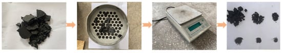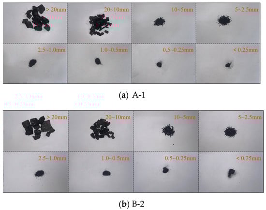 A schematic of the screening process is shown (Figure 10), and as shown in the figure, the crushed coal specimens were collected, screened, and weighed, following which eight groups of different ranks, namely, 0.00–0.25, 0.25–0.50, 0.5–1.0, 1.0–2.5, 2.5–5.0, 5.0–10.0, 10.0–20.0, and >20.0 mm, were screened. An electronic balance was used for weighing, and the screening results are shown (Table 1). The crushing-related morphology after screening is shown (Figure 11).