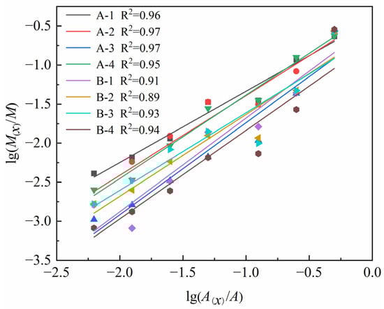 The slope k of the lg(M(x)/M)–lgA(x)/lgA curve may be obtained using Equation (3), and the relationship between the fractal dimension D and slope k is the following: