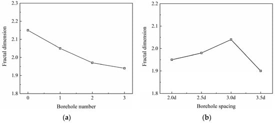 Relationship between the average fractal dimension and (a) different numbers of boreholes and (b) different spacing of boreholes.