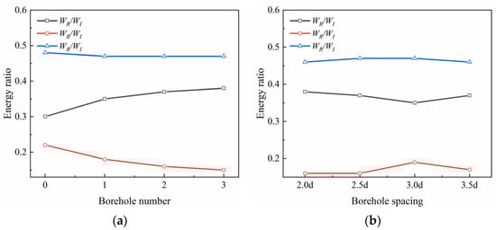 The relationship between the boreholes and the energy ratios for (a) different numbers of boreholes and (b) different spacings of boreholes.