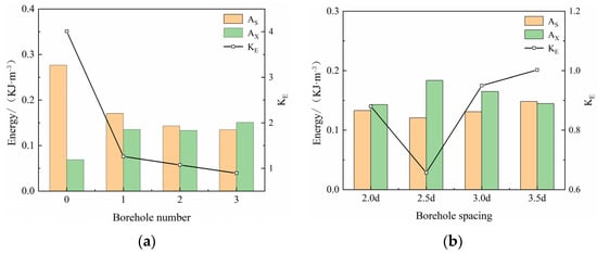 The dissipated energy of crushing refers mainly to the energy consumed by crack expansion in the coal specimens. Owing to the simultaneous transition of crack expansion in the coal specimens to the destruction of these specimens, as well as differences between individual coal specimens and errors in the kinetic energy of crushing and other energies, the overall trend in the change in dissipated energy becomes obscure. The coal around the borehole produces cracks under impact loading, and these cracks expand and penetrate each other, forming a crushing and pressure relief zone. This increases the reflection of the stress wave while simultaneously reducing the transmission of the stress wave, thereby reducing the damage caused to the surrounding rock by the impact stress wave under high strain-rate loading. The greater the number of boreholes, the larger the overall crushed zone formed by connected individual crushed zones, which can effectively enhance the ability to reflect the stress wave and reduce its transmission ability, resulting in the relief of pressure. Borehole spacing is also an important factor affecting pressure relief, where the smaller the borehole spacing, the greater the degree of fragmentation between boreholes, and the more obvious the effect of pressure relief. Therefore, a reasonable borehole spacing may help increase the effect of pressure relief, and also reduce labor and costs.