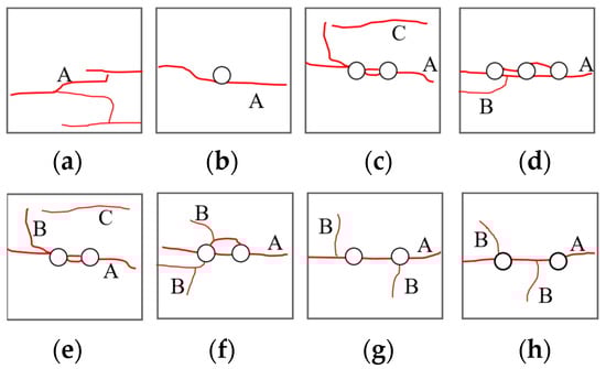 According to Section 3.3, the macro-damage form of the specimen manifested mainly as surface detachment and crack extension. Crack extensions caused by the development of internal joints in coal under the influence of the impact load on joints result in the dislodgement of coal pieces from the surface of the coal specimens, with such dislodgements showing a certain degree of randomness. In addition, the boreholes have a significant guiding effect on crack extension. The extended cracks in different borehole programs can be divided into A main cracks, B secondary cracks, and C far-field cracks. The main crack is a tensile crack produced by tensile stress, and its direction is parallel to the loading direction. The secondary crack is a fracture crack caused by extrusion, collision, and deformation between the coal itself and the compression bar during impact loading, and its direction is generally perpendicular to the main crack. The far-field crack, which is far away from the crack at the borehole, is related to the internal damage of the material.